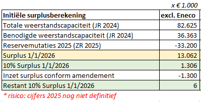 Het surplus wordt bepaald per 1 jan. van het desbestreffende begrotingsjaar, in dit geval 1 jan. 2026. Om het surplus te bepalen, is de totale weerstandscapaciteit uit de jaarrekening 2024 genomen en gecorrigeerd voor de benodigde weerstandscapaciteit. Vervolgens is het resterende getal gecorrigeerd voor de mutaties in de Algemene Reserve zoals deze in de Zomerrapportage 2025 gerapporteerd zijn. Deze berekening komt uit op een surplus van €13,1 miljoen, waarvan 10% onder voorwaarden ingezet mag worden als structureel dekkingsmiddel in 2026. Dit komt neer op € 1,3 miljoen.